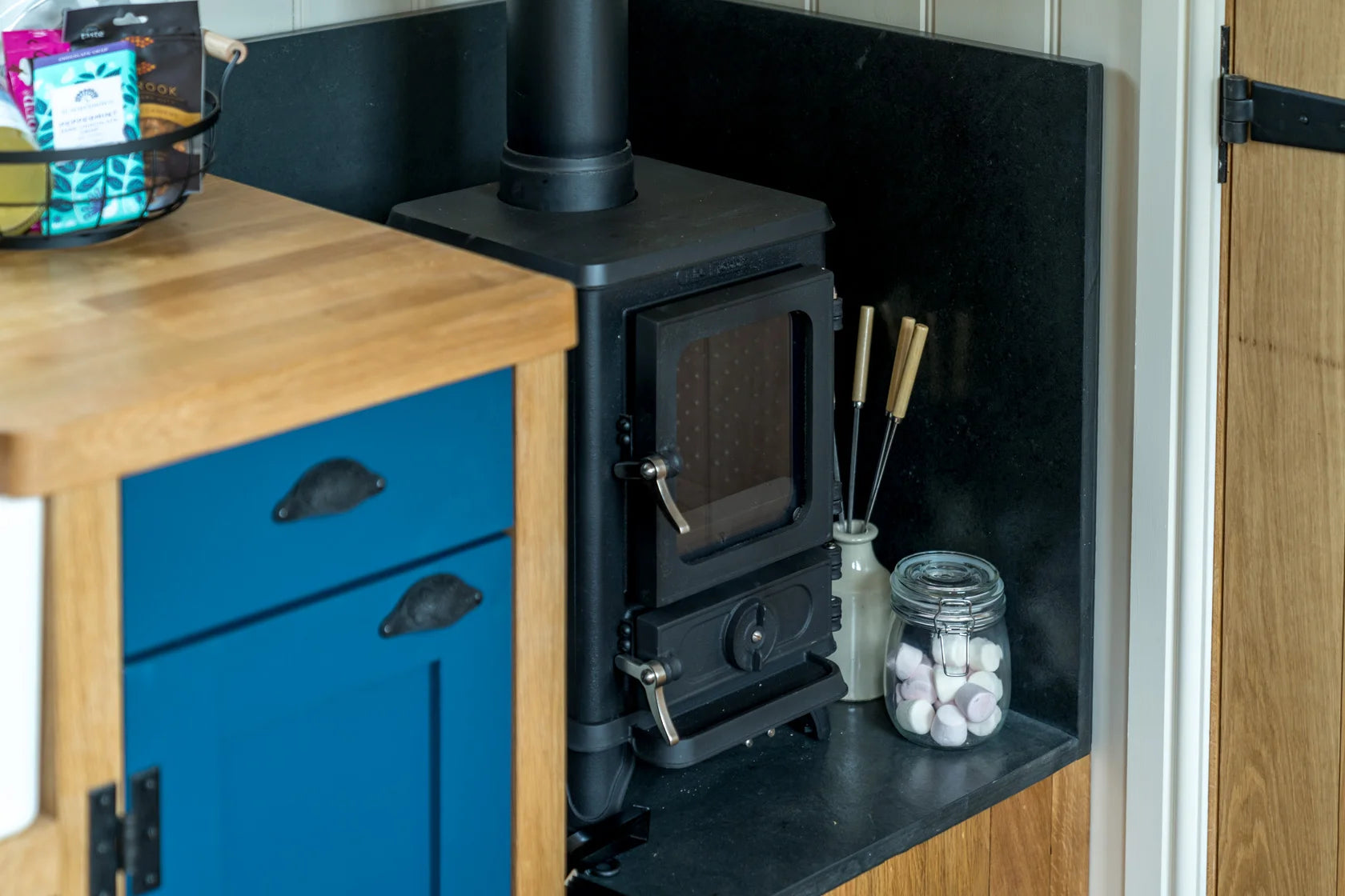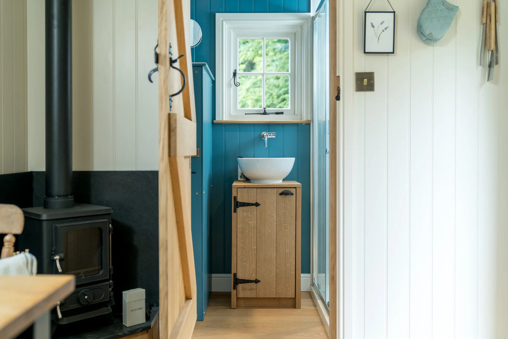 With itās striking navy exterior and expanse of exposed oak finishes, Kite shepherdās hut is the epitome of glamping luxury.Ā The wood-burning hot tub is the star of the show.